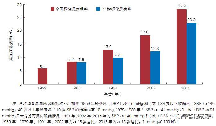 從1959年到2015年,高血壓患病率快速上升,至2015年全國調查患病率粗率已達27.9%,這意味著每四個成人至少有一個有高血壓。